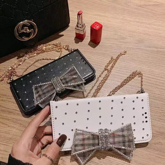 【すぐ発送】キラキララインストーン チェックリボン 手帳型 カード収納 チェーン付 レザー調 スマホ ケース カバー iphone アイフォンケース