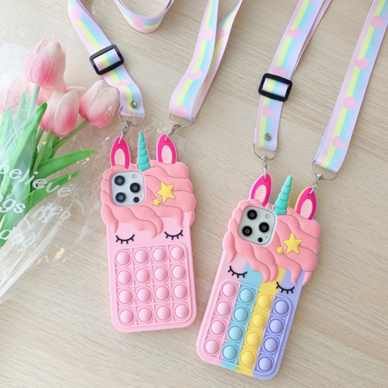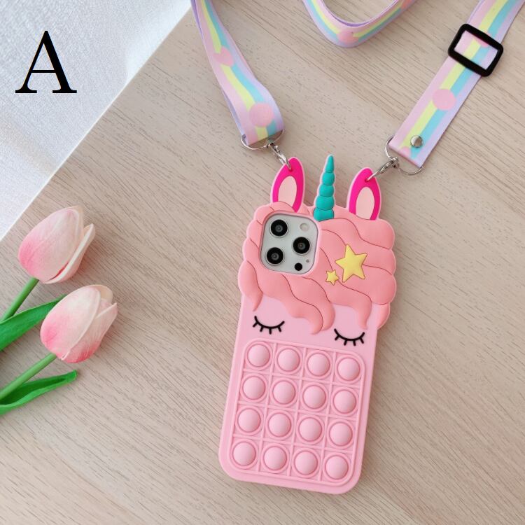 【プチプチプッシュデザイン】かわいいユニコーン ストラップ付 プチプチ スマホ ケース カバー iphone12 iphone12Pro MAX iphone12mini iphoneSE2 iphone7 8 Plus X XS XR 11 Pro MAX