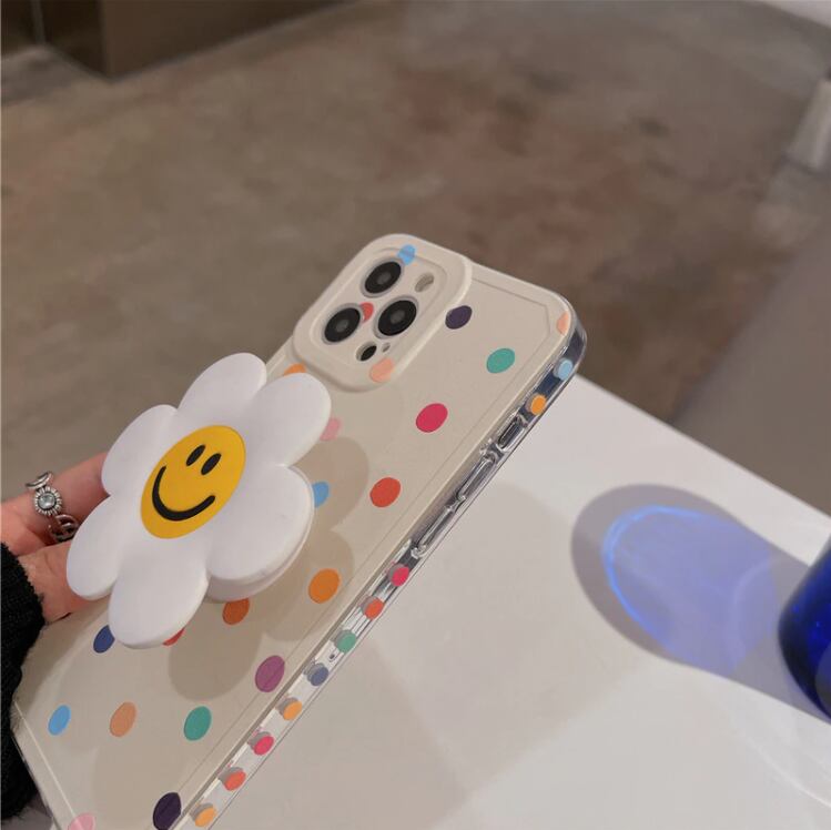 カラフル水玉 ドット サイドドットライン ニコちゃんフラワースタンドホルダー付き スマホ ケース カバー iphone 7 8 Plus SE2 X XS XR 11 Pro 12 mini MAX アイフォンケース