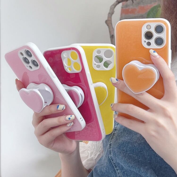 【イエロー系】ミルキーカラー ハート♡ ホルダースタンド付き スマホ ケース カバー iphone13 7 8 Plus SE2 X XS XR 11 Pro 12 mini MAX アイフォンケース