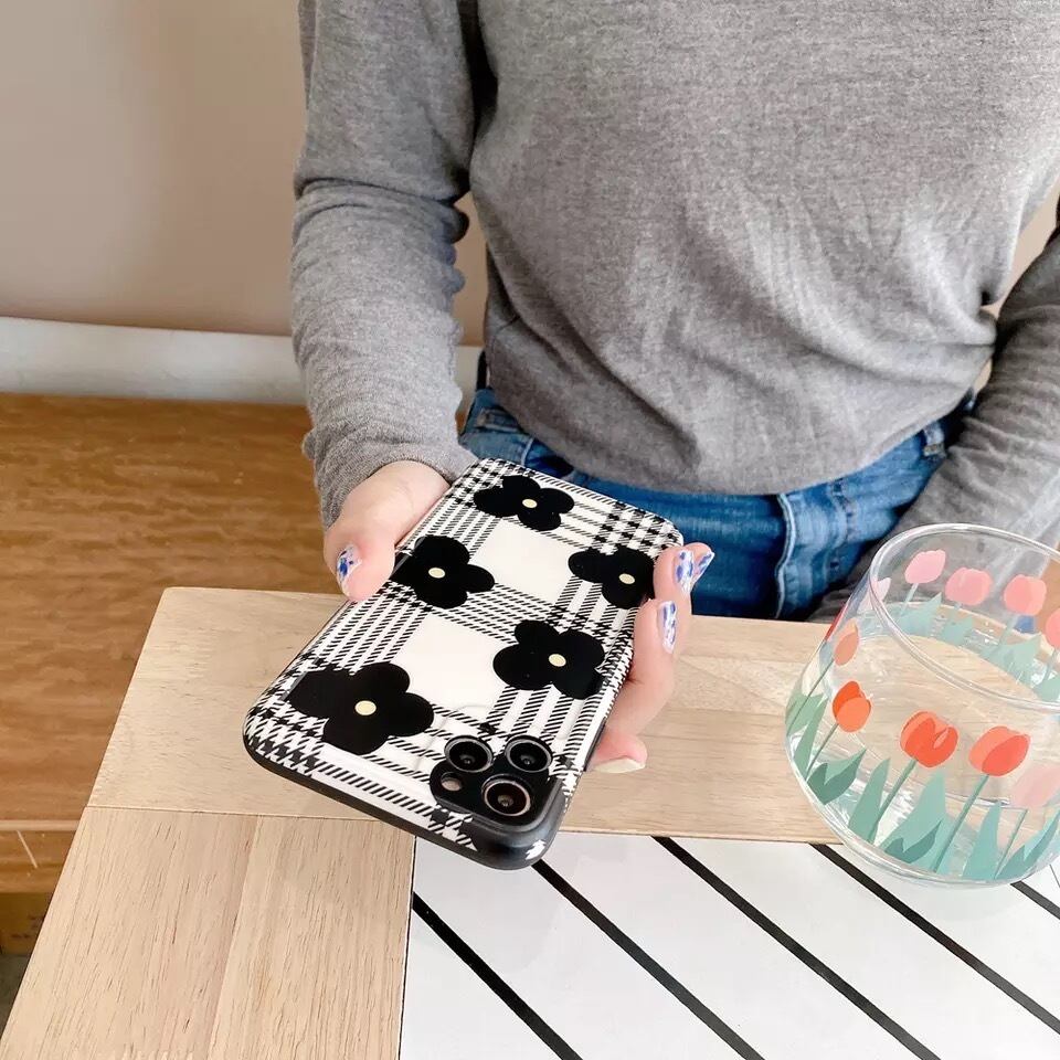 【iphone12mini】モノトーン チェック柄 ブラックフラワー スマホ ケース カバー iphone アイフォンケース