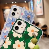 【ブルー系】水彩画風 フラワー 花柄 フラワーボールチェーン付き スマホ ケース カバー iphone13 7 8 Plus X XS XR 11 Pro 12 MAX アイフォンケース