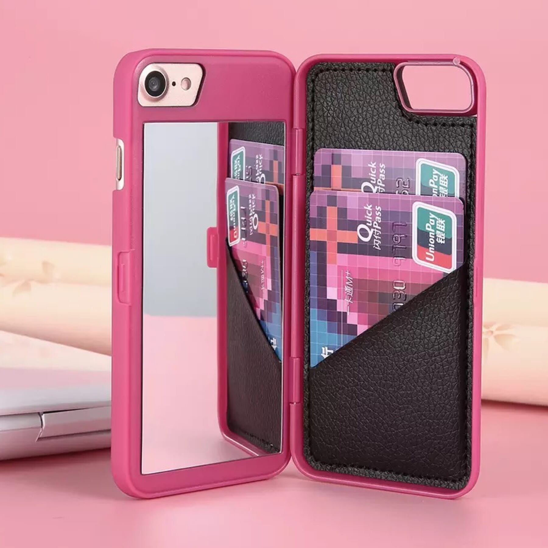【iphone7plus/8plus】カード収納 ミラー付き ショッキングピンク プラスチック スマホ ケース カバー iphone アイフォンケース