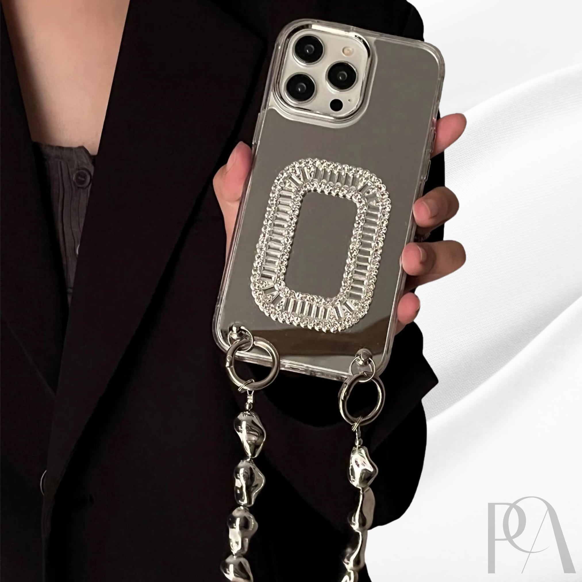 洗練されたキラキラジュエリーデザインが際立つ、ミラーデザインのケース。